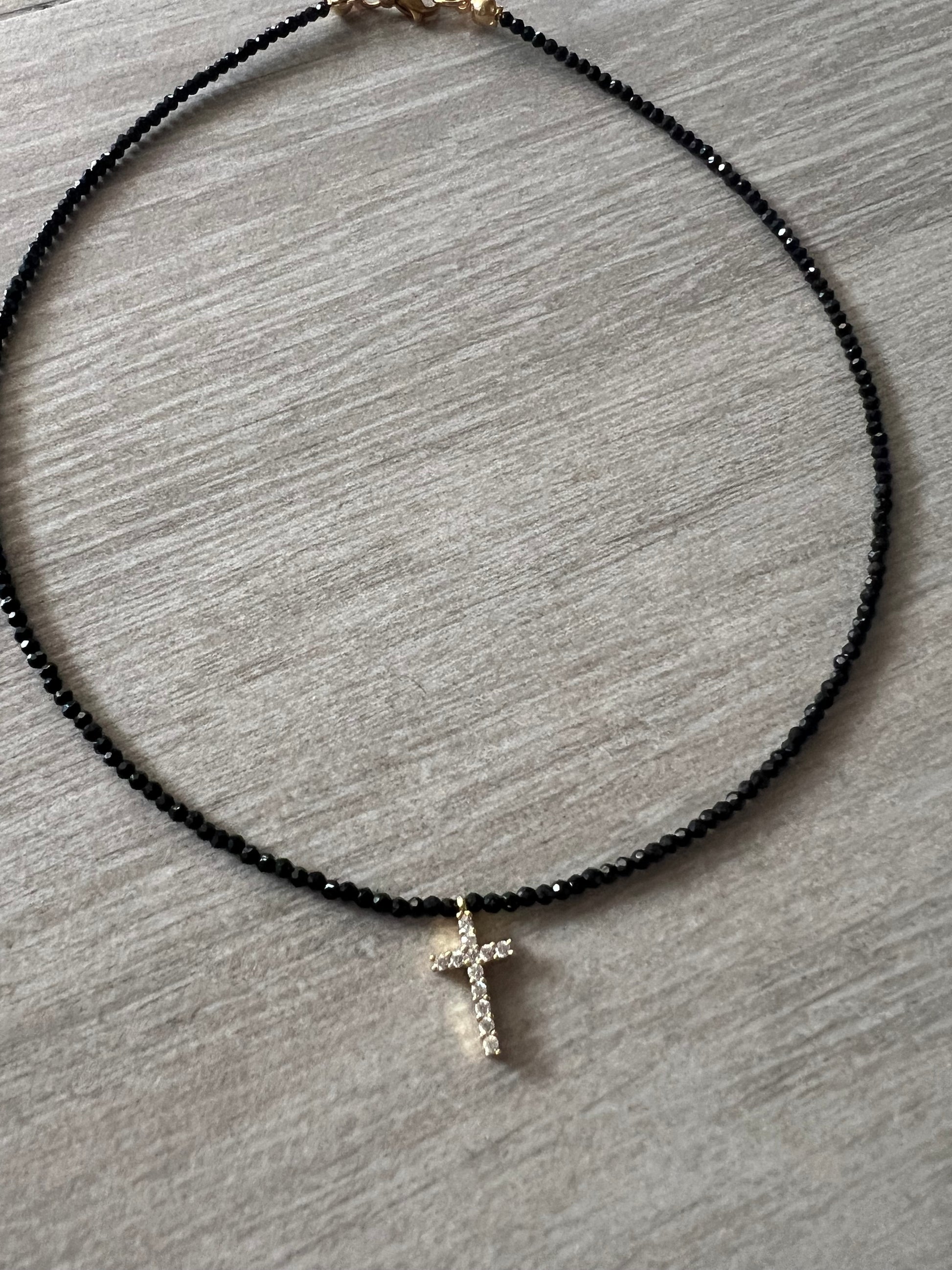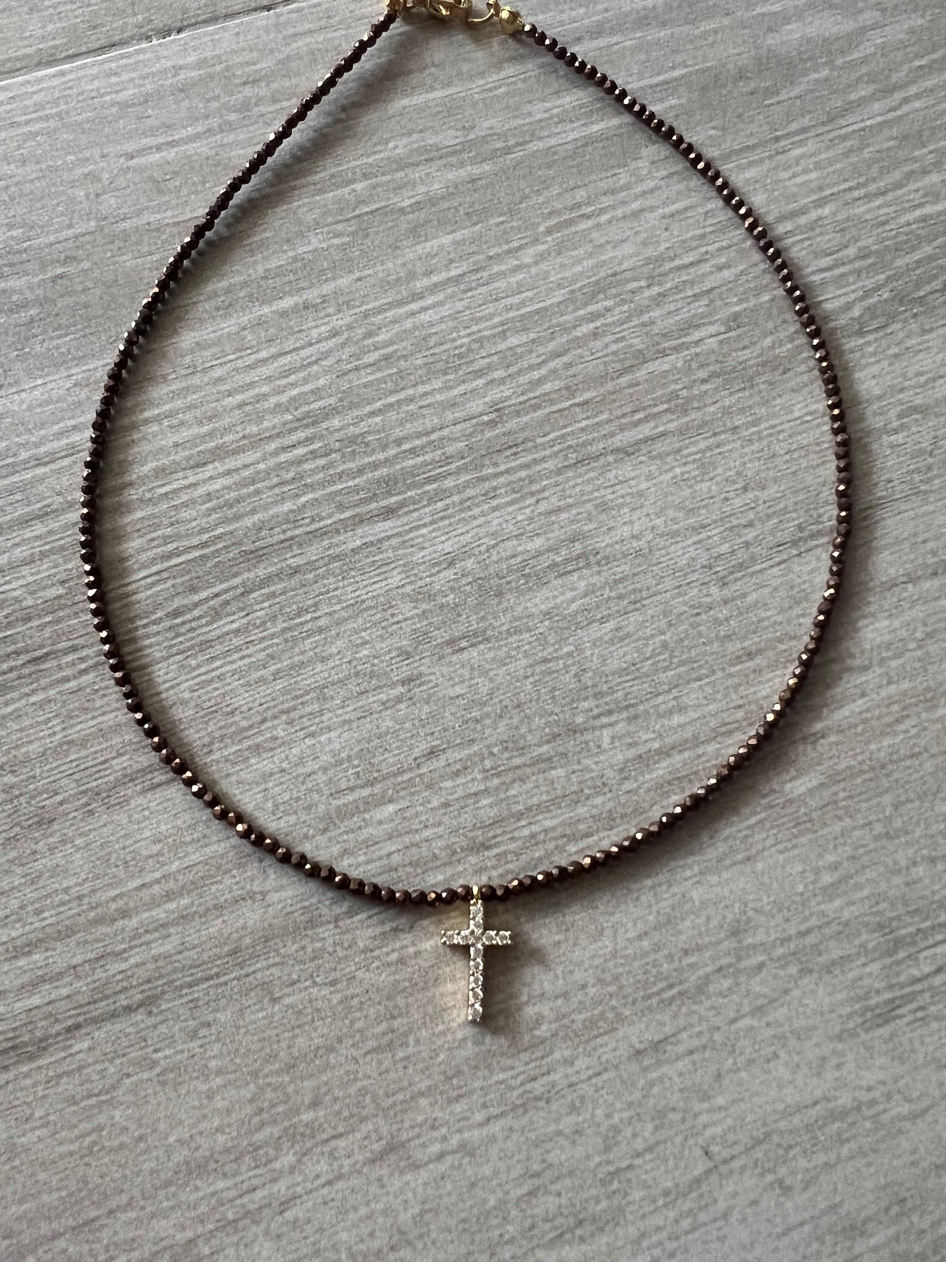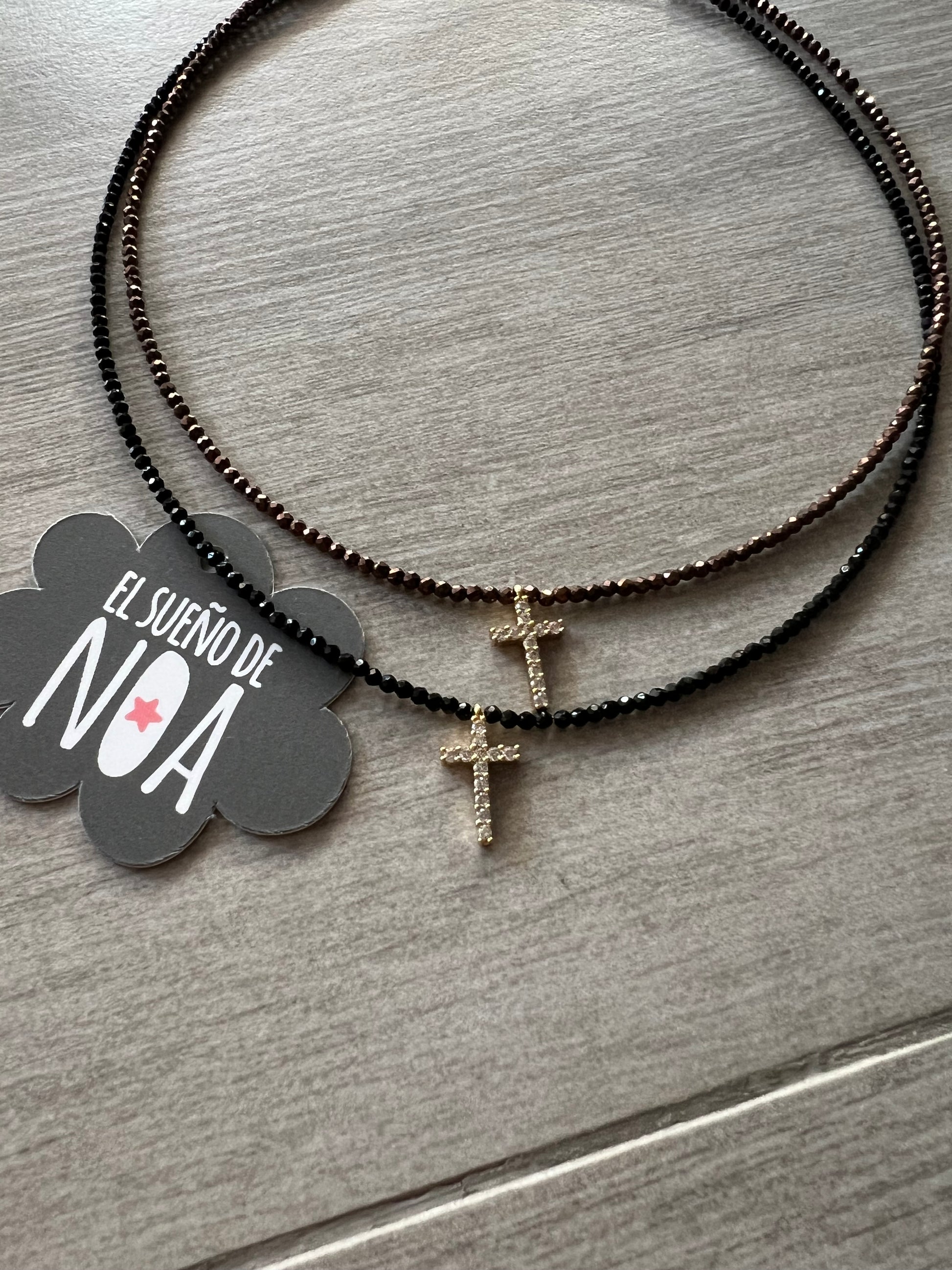 Gargantilla mini cristales con cruz de circonitas, acabados en acero.