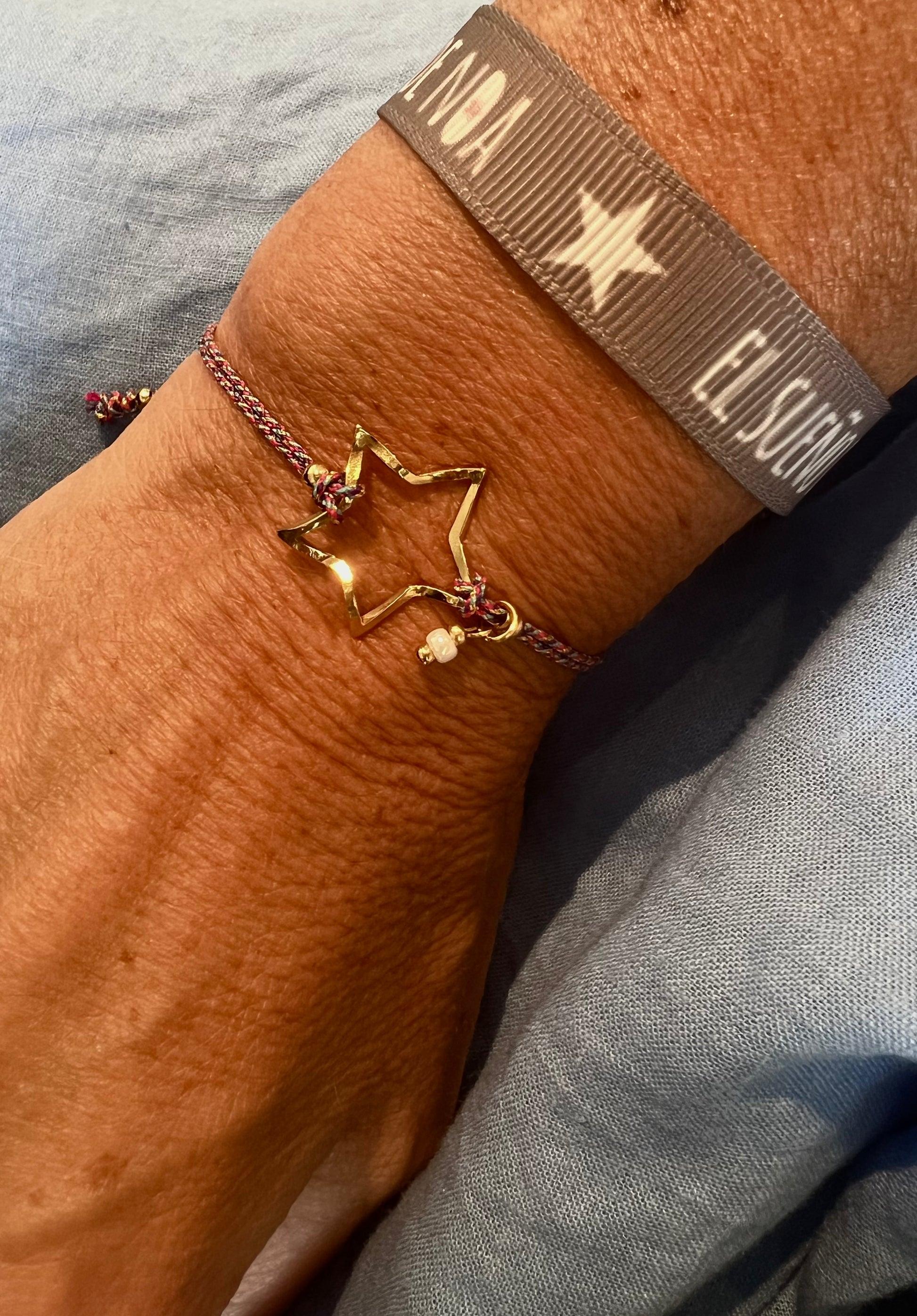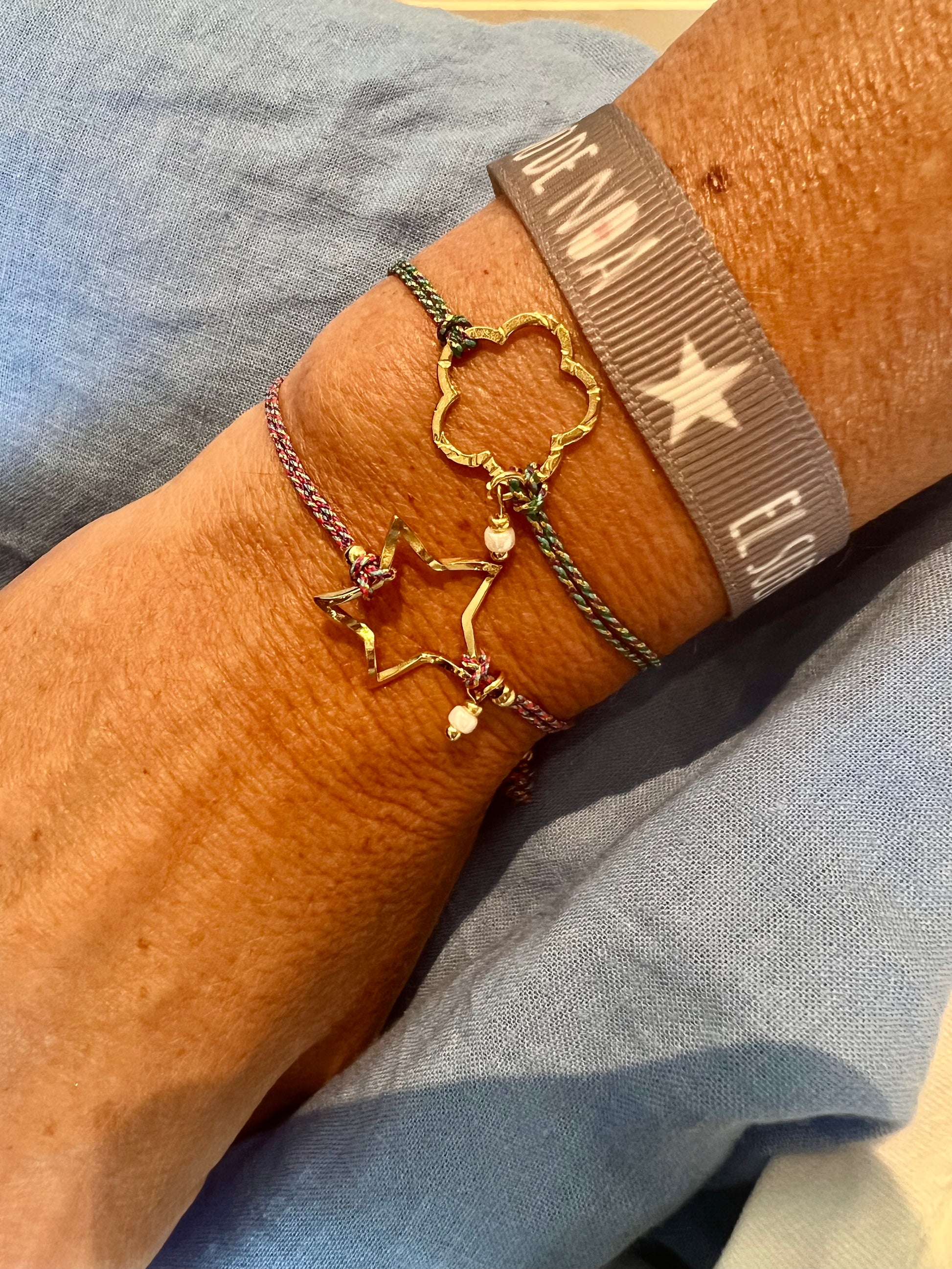 Pulsera hilo multicolor dorado fino, con figura en acero y nudo corredero.